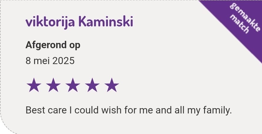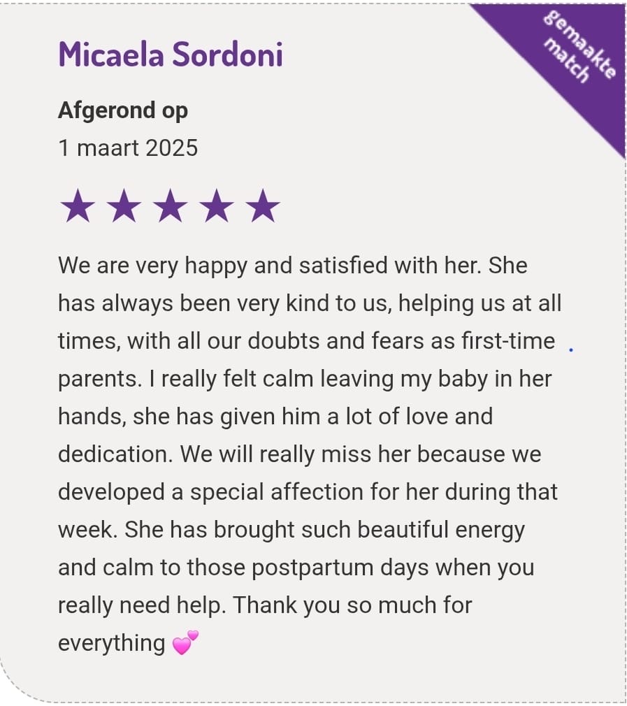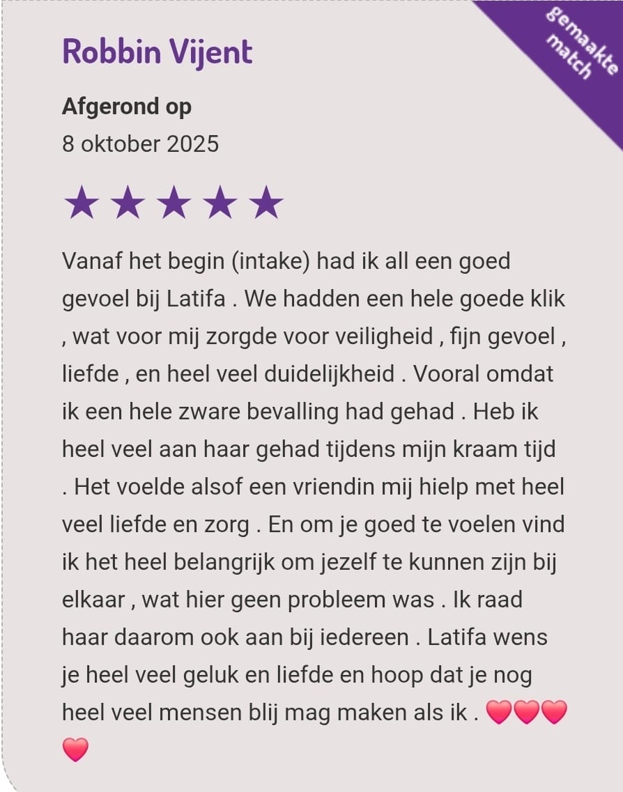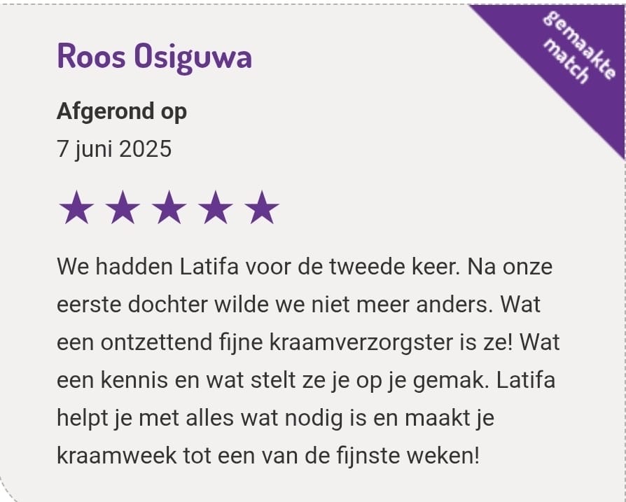 Geplaatst op Marleen17/11/2025Trustindex verifieert dat de oorspronkelijke bron van de recensie Google is. Wij hebben een hele positieve ervaring met Latifa. Naast de praktische ondersteuning die zij gaf, heeft zij veel kennis en bracht ze dit op een prettige manier over. We voelden echt dat we door haar gezien werden en dat zij meedacht in onze specifieke situatie (i.p.v. algemene tips), heel erg persoonlijk en empathisch. Op een fijne, rustige, manier aanwezig in huis. Van tevoren heeft ze duidelijk besproken wat we van haar konden verwachten en dit heeft zij waargemaakt. Wij bevelen haar dan ook zeker aan als kraamverzorgende.Geplaatst op Ester Wassenberg31/10/2025Trustindex verifieert dat de oorspronkelijke bron van de recensie Google is. Wij kunnen niet anders dan positief zijn over Latifah! We hebben bij de geboorte van onze eerste dochter zoveel van haar geleerd. Alle tips passen wij nog steeds toe. We kijken terug op een fijne kraamtijd met Latifah erbij in huis. Nogmaals heel erg bedankt!Geplaatst op Micaela Sordoni26/03/2025Trustindex verifieert dat de oorspronkelijke bron van de recensie Google is. We are very happy and satisfied with her beautiful work. She has been very kind to us and has helped us a lot with our baby. As first-time parents, we really needed her tips, experience and extra help. It was truly lovely and pleasant to leave our baby in her hands. She has brought a beautiful energy and calm to those difficult postpartum days 😊Meer laden